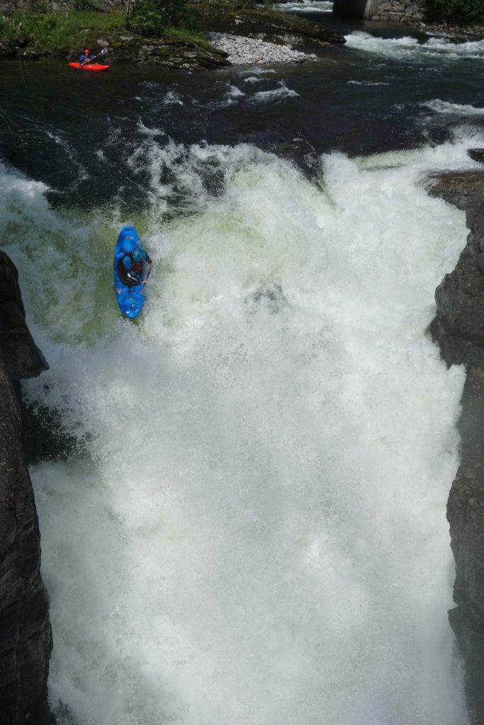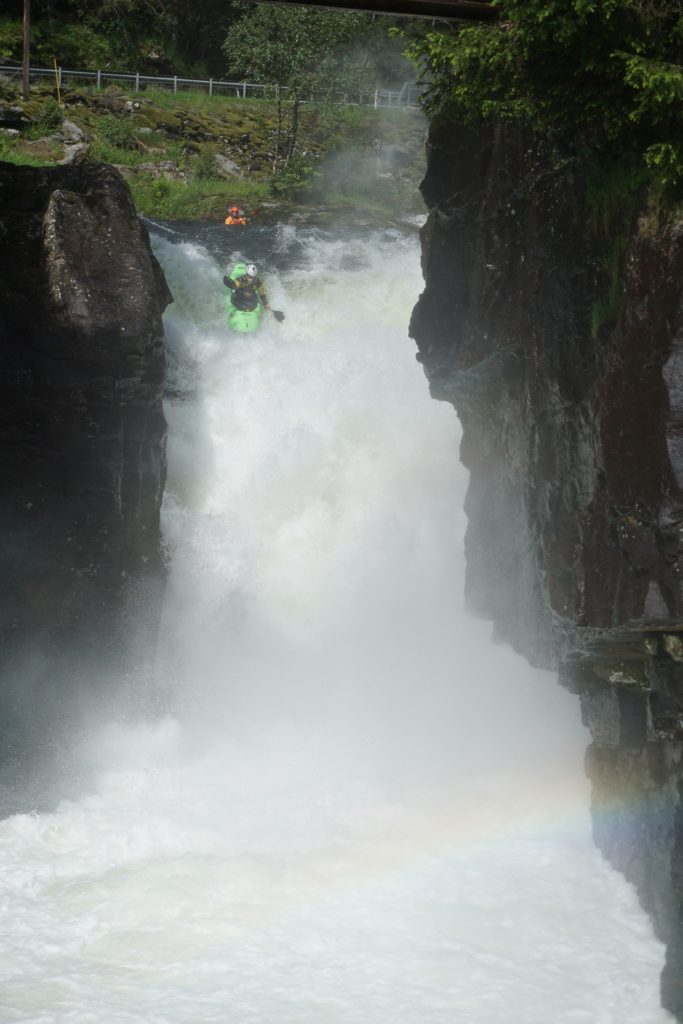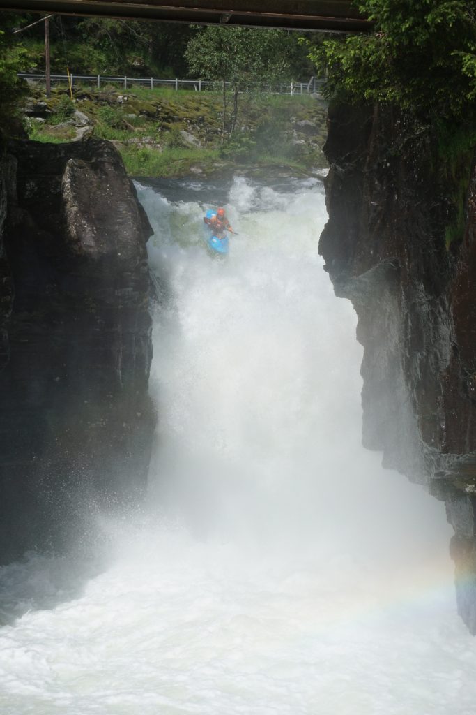Also wurde nach der Ankunft noch der „Myrkdalselvi Upper“ gepaddelt. Am Mittwoch ging es dann zum ersten Wasserfall „Money Drop“ auf der „Strondalselvi“. Danach hat sich die Paddlerfamilie dann aufgeteilt: Team „Bergischesland“ war an der „Raundelselvi“, Team „Süddeutschland“ war an der „Myrkdalselvi Lower“ und Team „Frau & Kids“ zur Shopping & Kaffeetour in Voss.